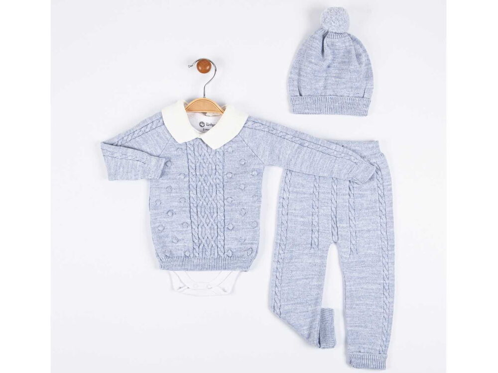 4079 Erkek Bebek Yakalı Örgü Desen Triko 4'lü Set * Kumaş İçeriği ; %20 Yün %60 Akrilik %10 Polyemit %10 Elit * Ürün İçeriği ; 4 parçadan oluşmaktadır. Kazak, Pantolon, Body ve Şapka * Bu üründe yüksek kaliteli pamuk kullanılmıştır. Doğaya duyarlı, bebek cildi ile uyumlu. Bebeğiniz için özenle tasarlandı. * Bebeğiniz için üretilen bu ürün % 100 Pamuk ipliği ile dokunmuştur. kullanılan her malzeme antialerjik olup, hassas bebek cildi ile uyumludur. * Kullanımı oldukça rahattır. * Yumuşak ve pamuklu dokusu sayesinde bebeğinizin cildi ile uyumludur. * Modern tasarımı ile bebeğinize şıklık katar. * 30 derecede ters çevirerek yıkamanız önerilir. * Orta sıcaklıkta ütülemeniz tavsiye edilir. * Ürünlerimiz bebeğinizin sağlığı düşünülerek birinci sınıf hammaddelerden üretilmiştir. * Bebeğiniz için zararlı kimyasallar içermez.