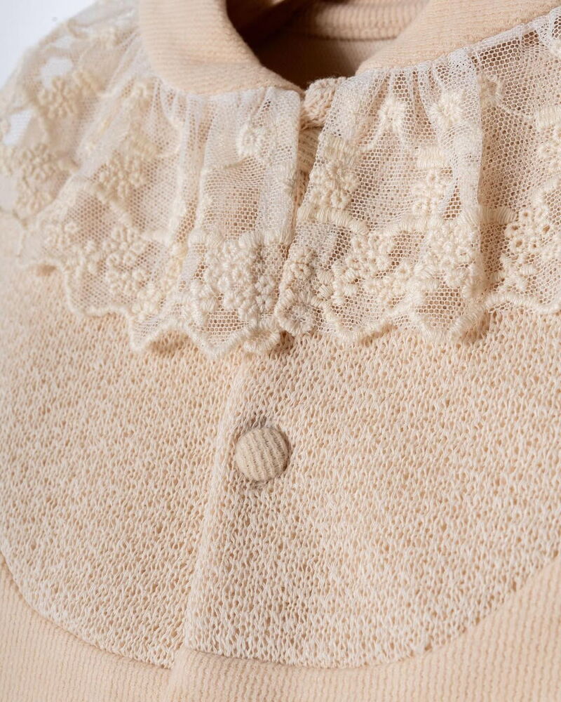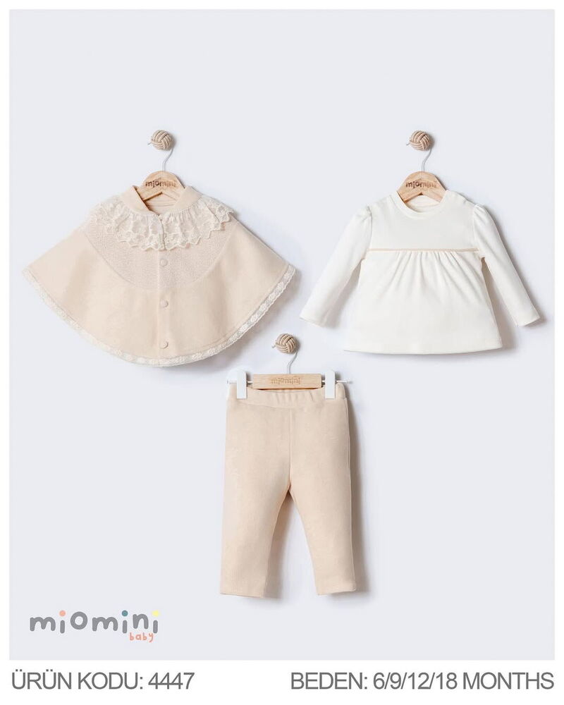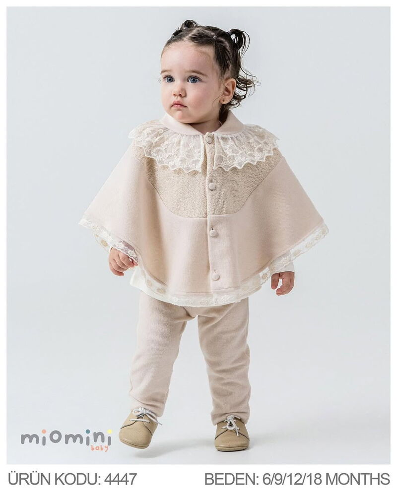 4447MN Kız Bebek Dantelli Pelerinli 3'lüi Takım * Kumaş İçeriği ; %100 Pamuktur * Ürün İçeriği ; 3 parçadan oluşmaktadır. Pelerin, Kazak ve Alt * Bu üründe yüksek kaliteli pamuk kullanılmıştır. Doğaya duyarlı, bebek cildi ile uyumlu. Bebeğiniz için özenle tasarlandı. * Bebeğiniz için üretilen bu ürün % 100 Pamuk ipliği ile dokunmuştur. kullanılan her malzeme antialerjik olup, hassas bebek cildi ile uyumludur. * Kullanımı oldukça rahattır. * Yumuşak ve pamuklu dokusu sayesinde bebeğinizin cildi ile uyumludur. * Modern tasarımı ile bebeğinize şıklık katar. * 30 derecede ters çevirerek yıkamanız önerilir. * Orta sıcaklıkta ütülemeniz tavsiye edilir. * Ürünlerimiz bebeğinizin sağlığı düşünülerek birinci sınıf hammaddelerden üretilmiştir. * Bebeğiniz için zararlı kimyasallar içermez.