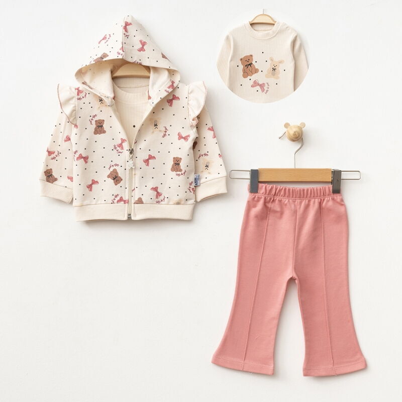 641P Kız Bebek Puanlı Ayıcık Hırkalı 3'lü Takım * Kumaş İçeriği ; %100 Pamuk * Ürün İçeriği ; 3 parçadan oluşmaktadır. Hırka , Alt ve Uzun kol body * Bu üründe yüksek kaliteli pamuk kullanılmıştır. Doğaya duyarlı, bebek cildi ile uyumlu. Bebeğiniz için özenle tasarlandı. * Bebeğiniz için üretilen bu ürün % 100 Pamuk ipliği ile dokunmuştur. kullanılan her malzeme antialerjik olup, hassas bebek cildi ile uyumludur. * Kullanımı oldukça rahattır. * Yumuşak ve pamuklu dokusu sayesinde bebeğinizin cildi ile uyumludur. * Modern tasarımı ile bebeğinize şıklık katar. * 30 derecede ters çevirerek yıkamanız önerilir. * Orta sıcaklıkta ütülemeniz tavsiye edilir. * Ürünlerimiz bebeğinizin sağlığı düşünülerek birinci sınıf hammaddelerden üretilmiştir. * Bebeğiniz için zararlı kimyasallar içermez.