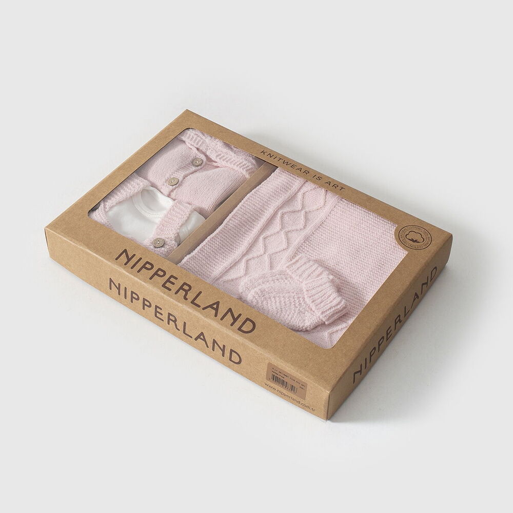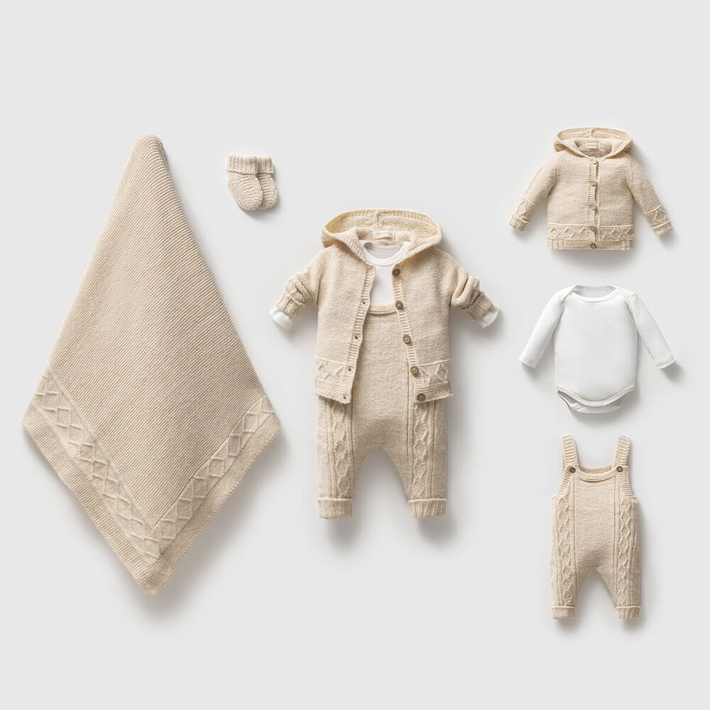 8351N Bebek Triko Baklava Desen Salopetli 5'li Kutulu Naturel Hastane Çıkış Seti * Ürün 5 parçadan oluşmaktadır. * Ürün içeriği Battaniye, salopet, hırka, eldiven ve body den oluşmaktadır. * Ürün %100 Pamuk Organik kumaştan üretilmiştir. * Yumuşak kumaş dokusuna sahiptir. * Ürün triko ve kışlıktır. * En üst kalite baskı ve detaylara sahiptir. * Regular kalıptır. * Modern tasarımı ile bebeğinize şıklık katar. * 30 derecede ters çevirerek yıkamanız önerilir. * Orta sıcaklıkta ütülemeniz tavsiye edilir.
